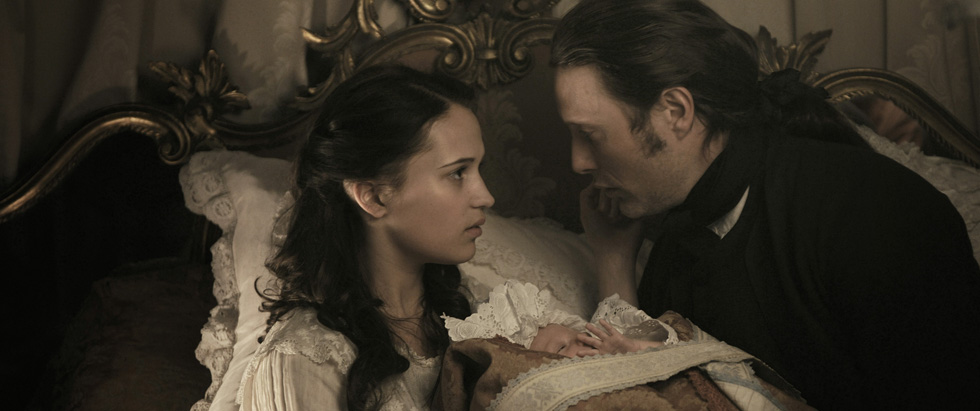 English princess Caroline Mathilde (Alicia Vikander) narrates her tale of woe, starting with her marriage to the childishly deranged King Christian VII (award winning Mikkel Følsgaard, in the performance of the year so far). Caroline is immediately rejected by the King, who prefers whore houses and gallivanting, and while hurt by his actions, she resigns herself to a life of relative solitude. This vastly changes, however, when the King returns from a tour of Europe with his new physician Johann Struensee (Mads Mikkelsen) in tow. He seems betrothed to entertain the king, not actually treating him for whatever condition he has. The Queen soon finds kinship with him based on their mutual ideals and philosophies, and this quickly leads to a clandestine affair. Wielding more power than a physician should, Johann has the ear of the king and inserts himself into a new council, spreading his ideas and quickly attracting many enemies. The outcome of this changes not only their love but Denmark itself forever.